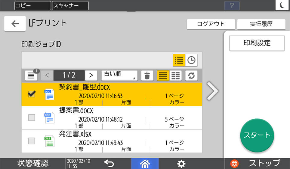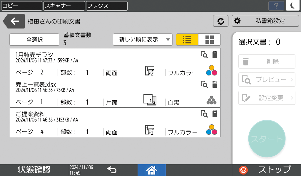 印刷文書をいったん複合機に蓄積し、複合機の画面上で内容を確認してから印刷することができます。印刷文書は、利用者それぞれの「私書箱」に自動的に分けて蓄積されますので、管理の手間をかけることなく、ミスプリントや印刷物の取り違え/混入/放置を防げます。