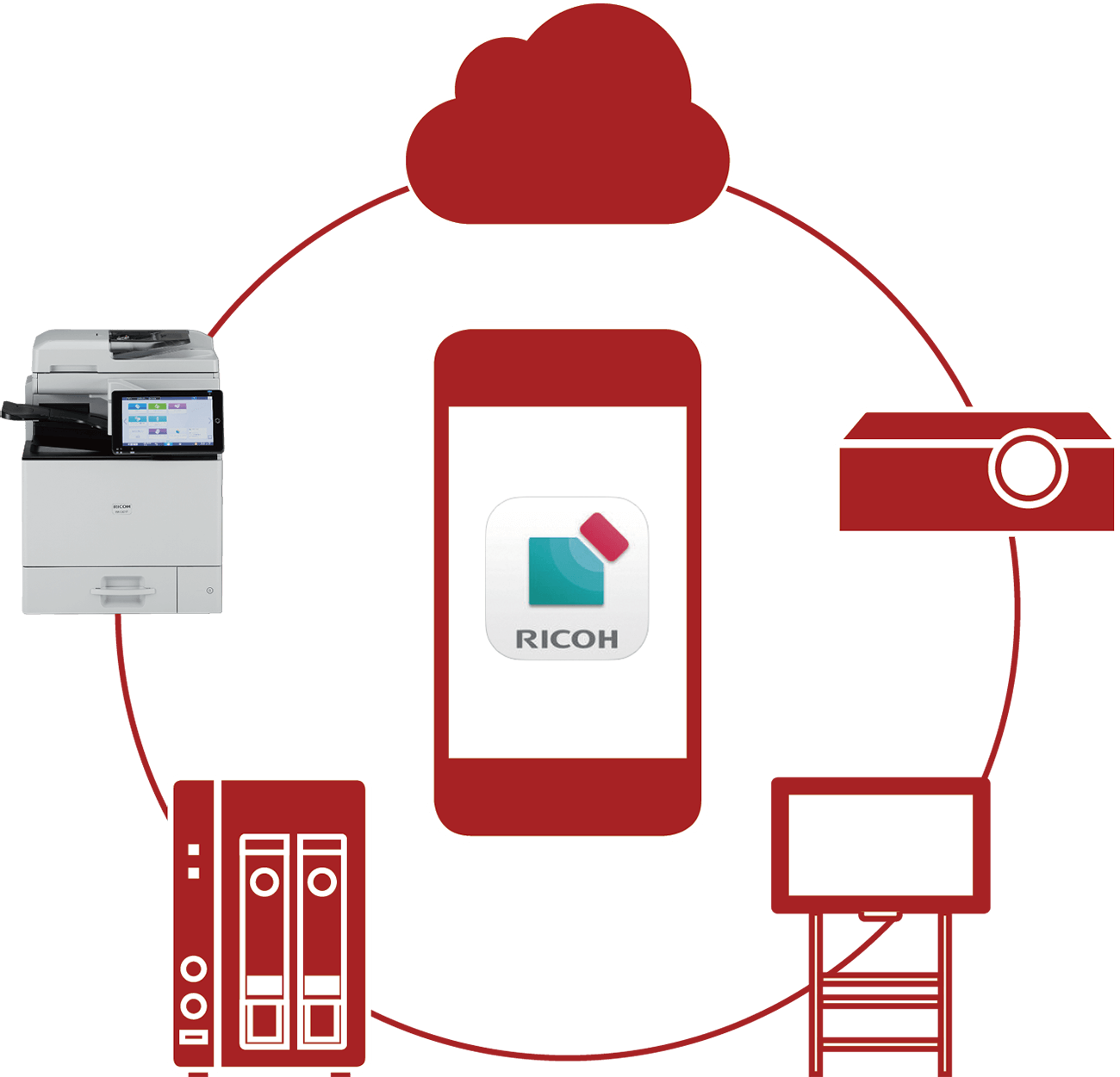 タブレット端末やスマートフォンをリコー複合機と接続することで、プリントやスキャンなどの操作ができる無料のスマートデバイス用アプリです。また、リコー製プロジェクターやインタラクティブホワイトボードとも連携したデータ共有が可能です。