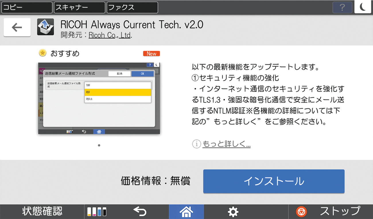 お客様が複合機を常に最新の状態でお使いいただくための仕組み「RICOH Always Current Technology」に対応。ご導入後も市場やお客様の環境の変化に迅速に対応し、最新の価値を提供します。アップデートはお客様自身が簡単に行なうことができ、いつも新しい機能をお使いいただけます。