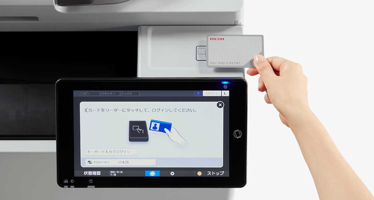 非接触ICカード「FeliCa」「MIFARE」「eLWISE」を用いた個人認証システムとして、リコー 個人認証システム AE2、RICOH カンタンセキュアプリント for Cloudをオプションでご用意。ICカードの汎用領域の情報で認証したり、Windows Active DirectoryやLDAP、Microsoft EntraIDとも連携することが可能です。また、オンデマンド印刷に標準対応し、印刷物の取り違えや取り忘れを抑止し、セキュリティーの向上に貢献します。 ユーザーごとに使える機能、権限を設定し、TCOの削減効果も期待できます。