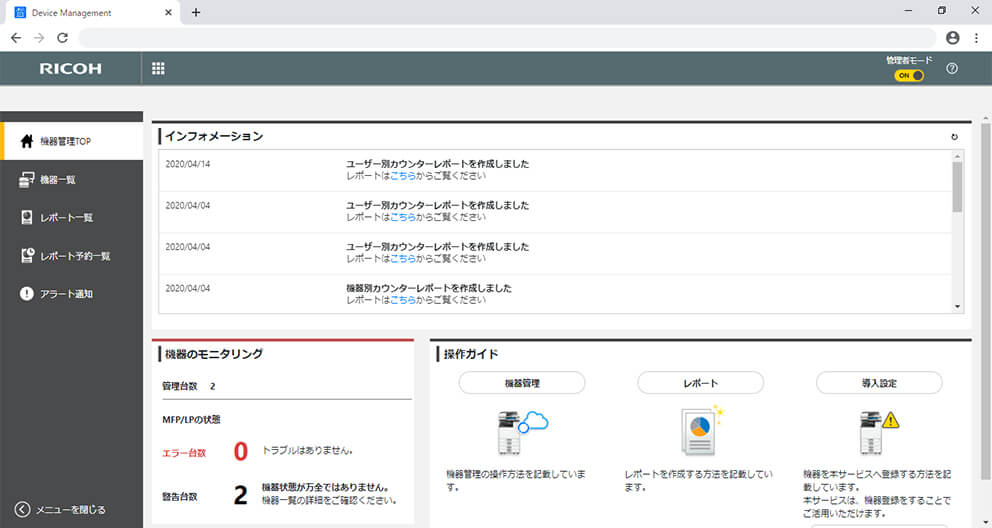 リコーのクラウドを介して、ご契約中の複合機・プリンターからならどこでも出力を可能にするアプリケーションです。PINコードやICカードを利用した認証により、個人の印刷データを任意の場所・タイミングでセキュアに受け取ることができます。さらに複合機の利用情報をクラウド上に収集し、自動でレポートを作成。リアルタイムな機器の一元管理を実現します。