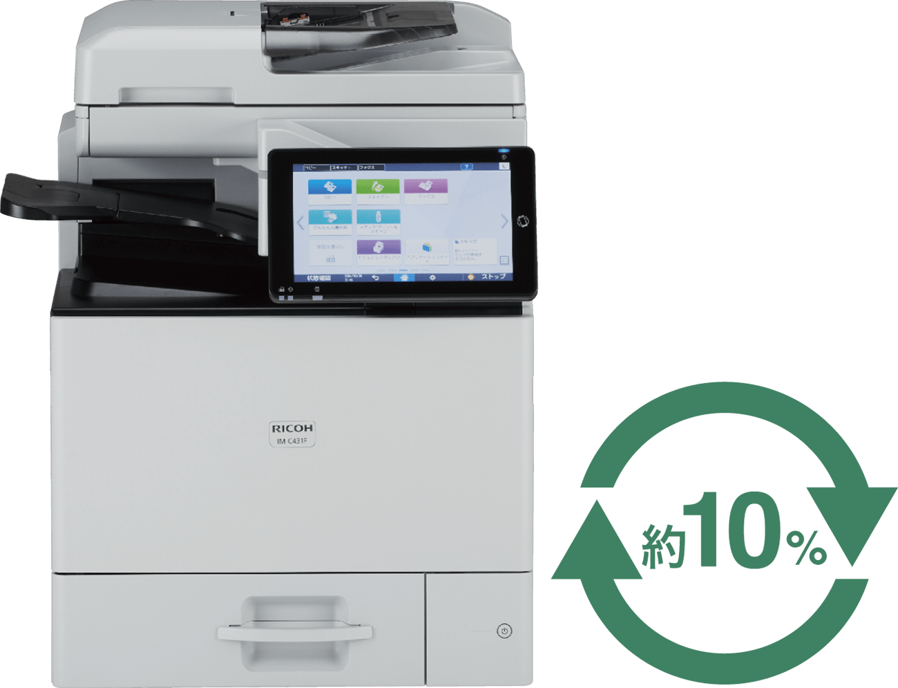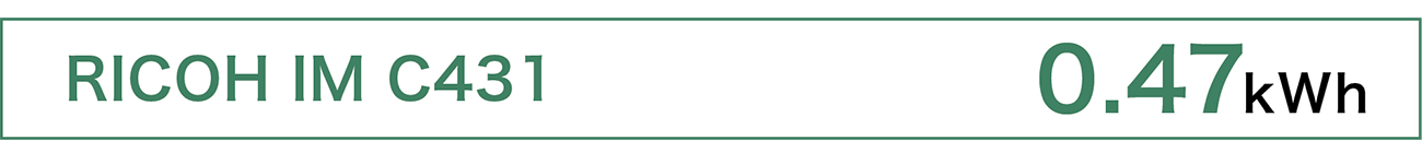 原材料調達から廃棄・リサイクルまでで排出された温室効果ガスの量をCO2量に換算し算出。RICOH IM C431は825kg-CO2、RICOH IM C431Fは851kg-CO2。(本体のみ)