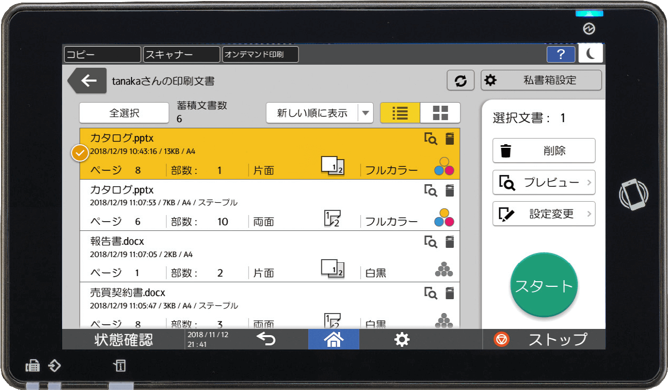 印刷文書をいったん複合機に蓄積し、複合機の画面上で内容を確認してから印刷することができます。印刷文書は、利用者それぞれの「私書箱」に自動的に分けて蓄積されますので、管理の手間をかけることなく、ミスプリントや印刷物の取り違え/混入/放置を防げます。