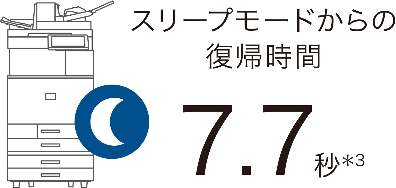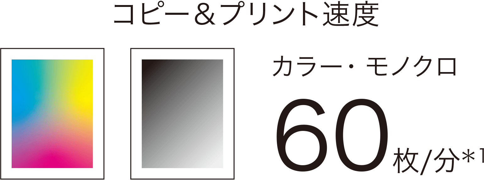コピー/プリント速度はカラー・モノクロ同速片面60枚/分*1。またファーストコピータイムはカラー4.2秒*2(モノクロ2.9秒*2)、スリープモードからの復帰時間は7.7秒*3と1枚目の出力を素早く実施でき、業務フローを円滑に進めることができます。
