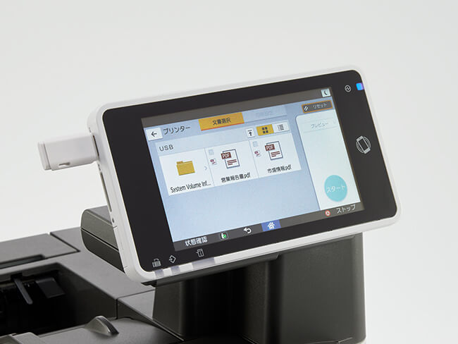 パソコンの起動や、プリンタードライバーの設定を行なうことなく、USBメモリー*やSDカードに保存されているJPEG/TIFF/PDFファイルを誰でも簡単に出力可能。さらに、先頭ページのプレビューやパスワードで保護されたPDFの出力もできます。