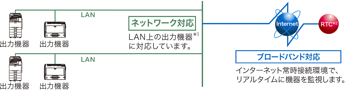 @Remoteとは、ネットワーク上の出力機器をより“快適”かつ“安心”して、お客様にご利用いただくためのLAN/ブロードバンド環境に対応した新しいリモートサービスです。リアルタイムに品質・稼働情報をキャッチすることで、的確&スピーディーなサービスを実現します。