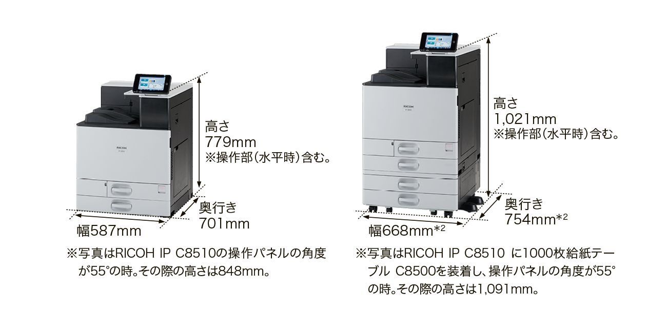 RICOH IP C8510/C8510M/C8500/C8500Mに2000枚給紙テーブル C8500、A4大量給紙トレイ C8500装着時。
