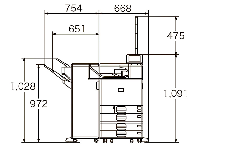 | オプション | 500枚増設トレイ:590枚 1000枚給紙テーブル:1,180枚(590枚×2段) 2000枚給紙テーブル:2,150枚(1,075枚×2セット) A4大量給紙トレイ:1,770枚 |