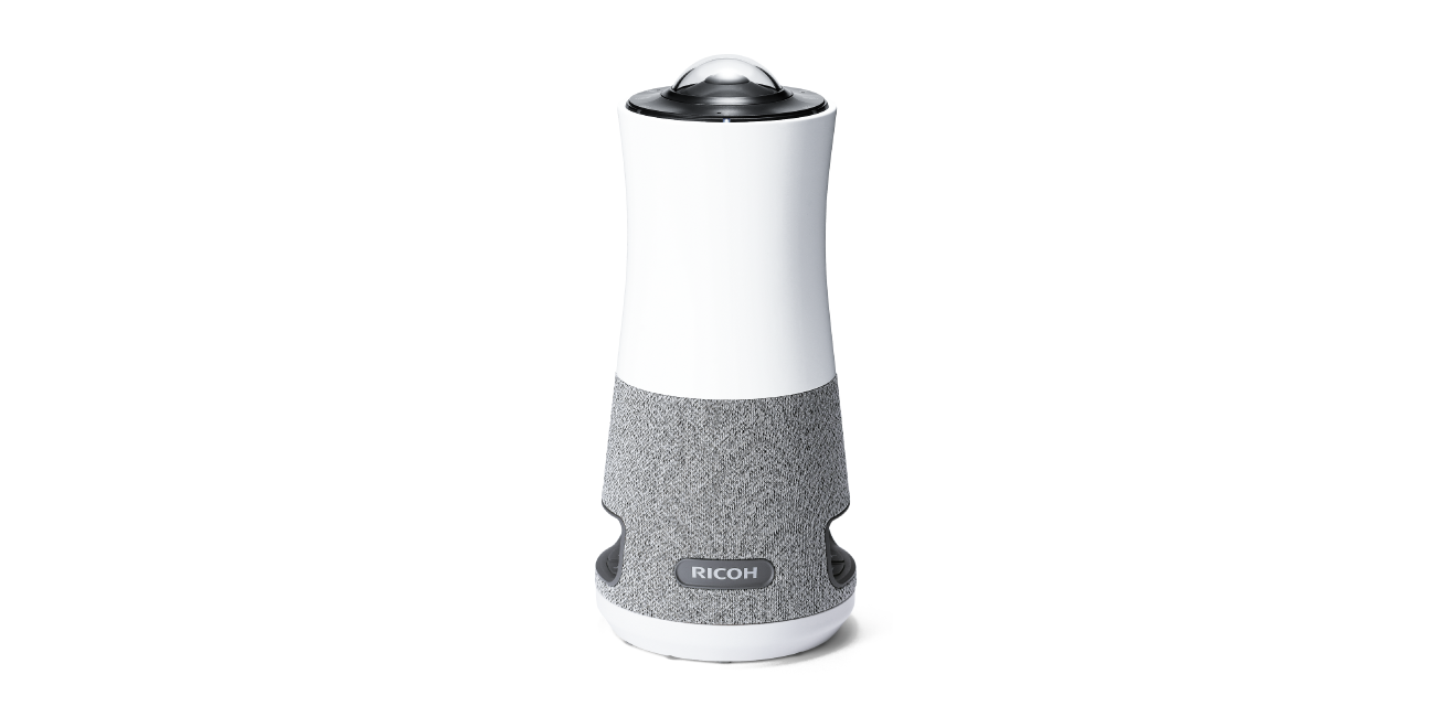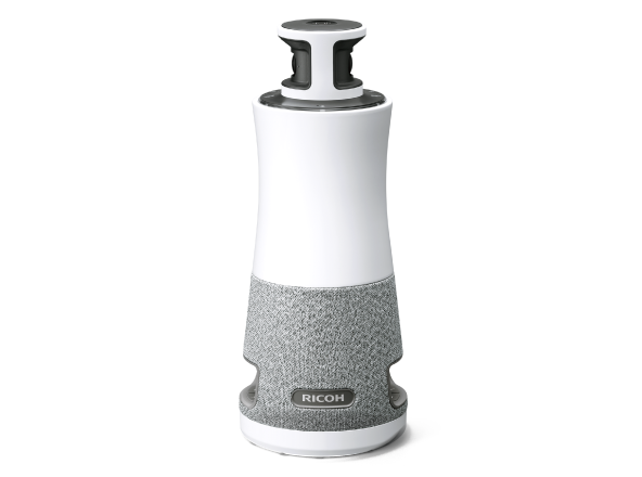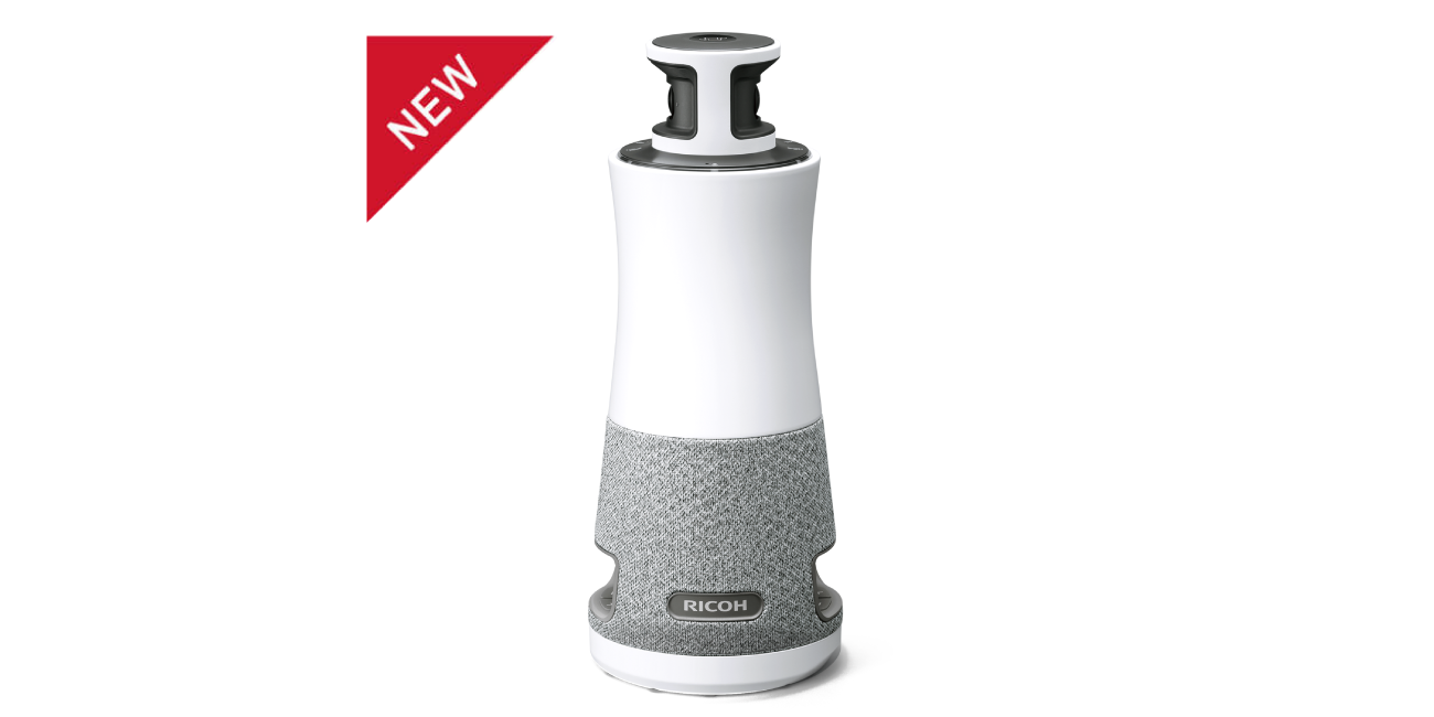 RICOH Meeting 360 V2 は、360°カメラを搭載した WEB 会議用マイクスピーカーです。会議室内の参加者の発言や動きを全方位で認識して、自動でクローズアップ表示を行います。会議室の広さに応じて、RICOH Meeting 360 V2 を連結して2台での対応も可能です。