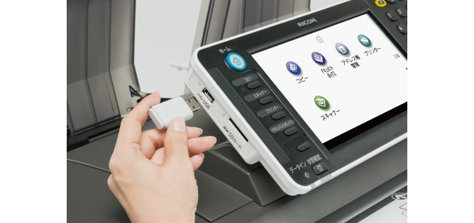 スキャンした文書をUSBメモリーやSD カード(32㎇以下)に直接保存することが可能です。パソコンレスで、紙文書の電子化・保存を簡単に行なうことができます。