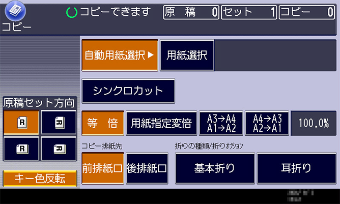 簡単画面キーを押すだけで、基本機能をシンプルにまとめ、文字を5mm以上の高さにした一層見やすい画面に切り替わります。また、フルカラータッチパネルの色を反転させることで、高齢者や弱視の方にも見やすい画面を実現しています。