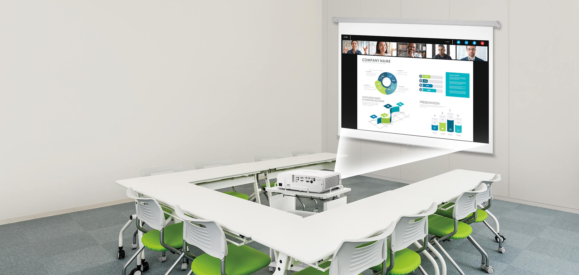 会議室などで110型を投映する場合、画面の最下部が床から1m以上の高さがないと、後方着席者からの視認性が悪くなります。本機では一般的な置台に設置した際でも、上方向に最大60%移動するワイドなレンズシフトにより、本体をかたむけることなく画面の高さを確保できます。台形補正機能を使わないので、WUXGAの高解像度を損なうことなく、良質なコミュニケーションをサポートします。