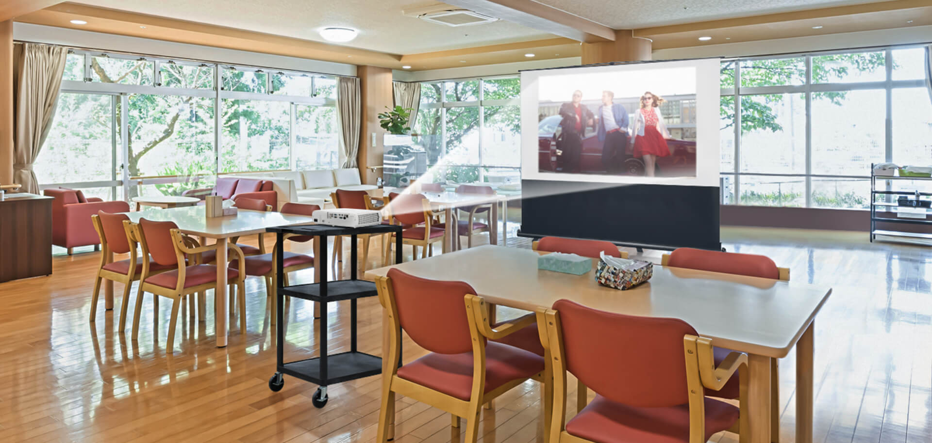昨今、パブリックスペースを活用したミニマルなイベントや集会が増える中、大型映像の需要が拡大しています。さらに各種施設の多目的施設で行われるレクリエーション用途のニーズも増加しています。その際 中核となるプロジェクターとモバイルスクリーンに加え、等しく不可欠な拡声システムを含めた、シンプルで可搬型のソリューションが、潜在するニーズにまでもお応えします。