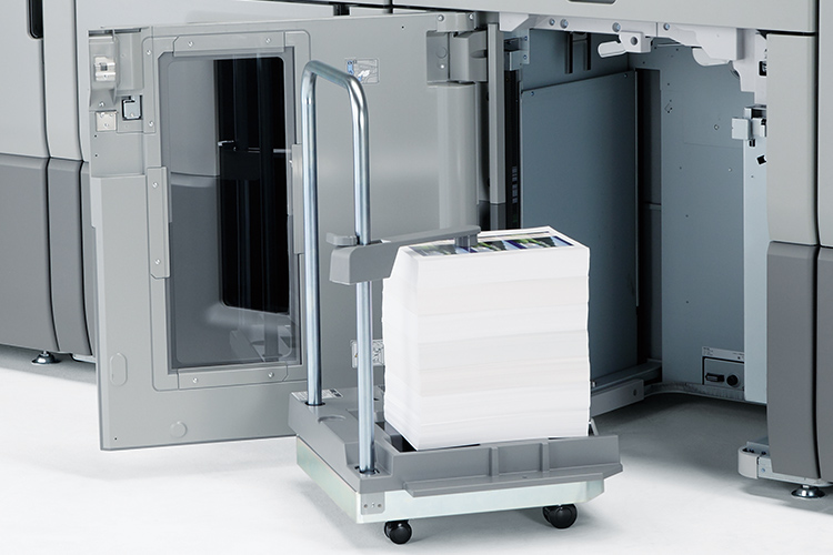 5,000枚収容可能*な台車付スタッカーです。2連結することで、最大10,000枚の排紙が可能です。
