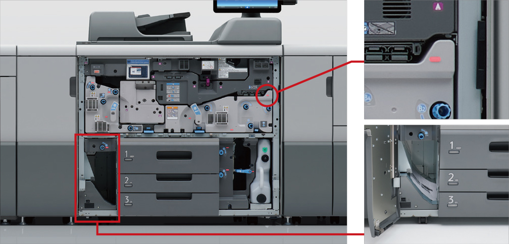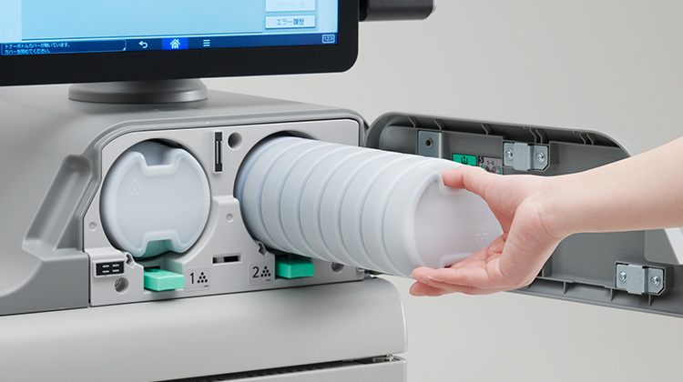 トナーボトルを同時に2本セットでき、エンジン作動中でもトナーボトルを交換可能。大量印刷時の生産性アップに大きく貢献します。