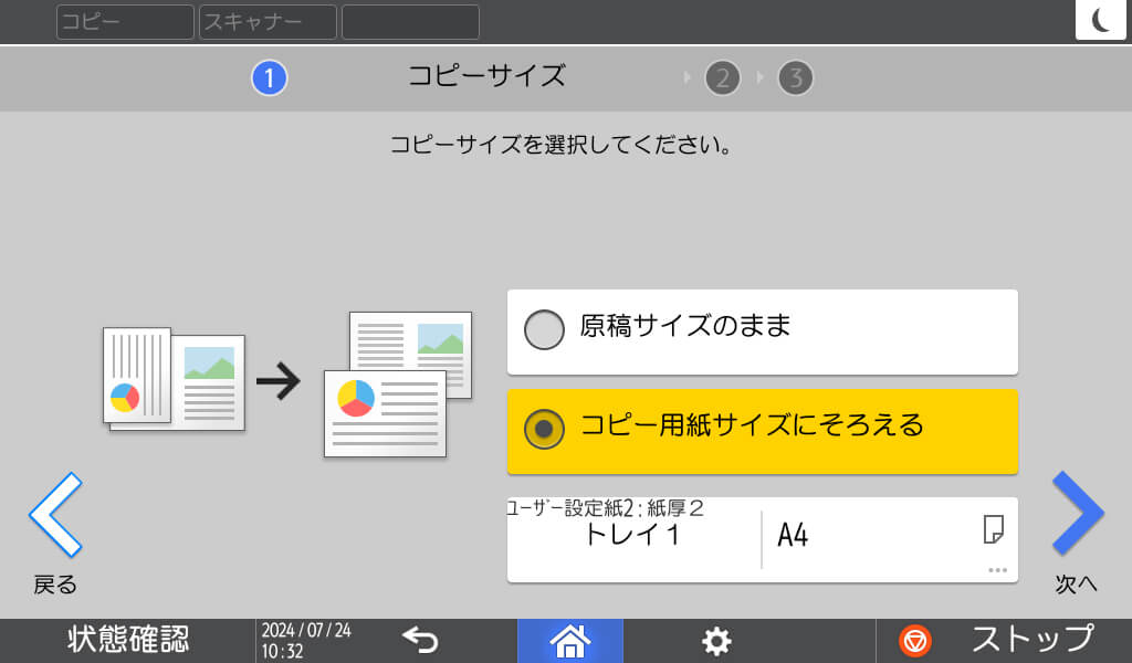 操作ガイドに従って設定でき、異なるサイズの原稿をまとめてコピーできます。サイズを統一してコピーすれば、再出力するときに、サイズを統一する設定を省略できます。