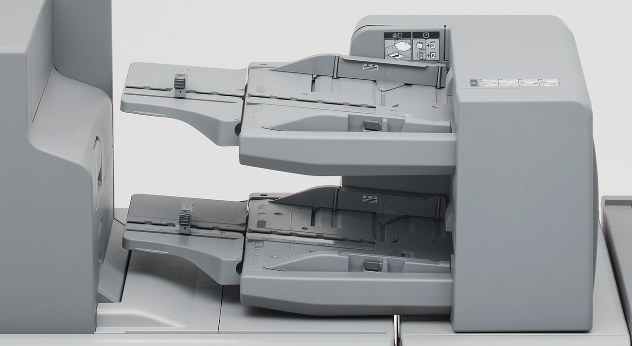 紙揃え機能を搭載したスタック枚数3,500枚(A4横送り)のフィニッシャー。上段1,000枚、下段2,500枚に対応したシフトトレイを採用。2段のシフトトレイによるリミットレス排紙も可能になり、優れた生産性を実現します。また、最大30枚*1120ページの中綴じ製本が可能で、不定形サイズの中綴じにも対応。最大6枚の二つ折り*2や、2穴パンチ機能*3にも対応しています。