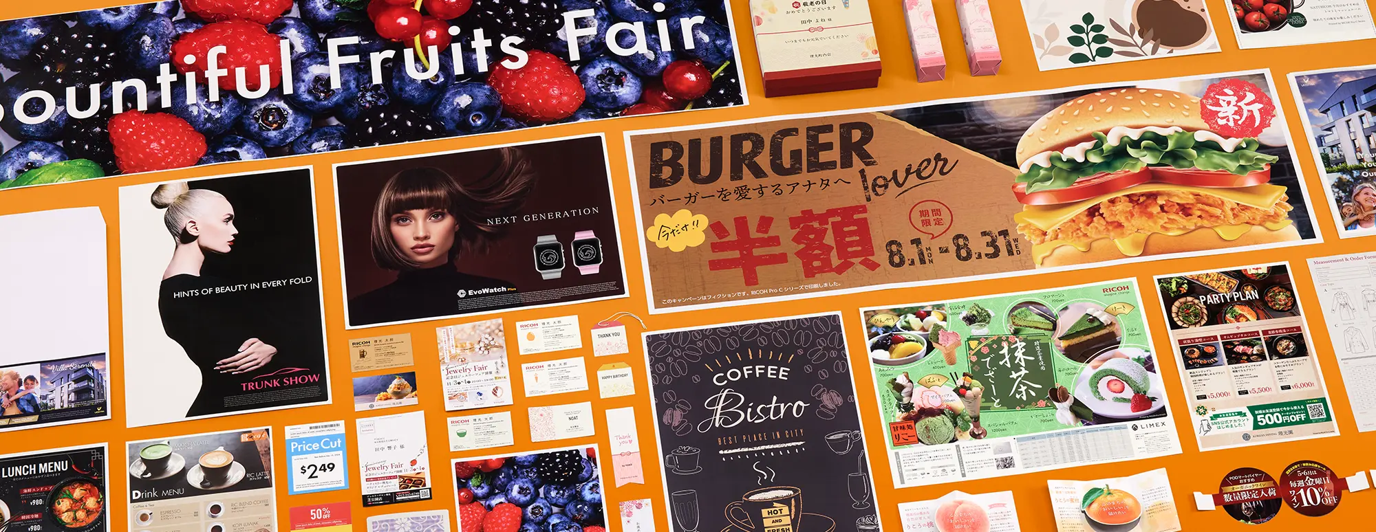 紙厚52.3~360g/m2、用紙サイズ90×139.7mmから330.2×1,300mm*1*2に対応。さまざまなサイズの用紙が取りあつかえます。チラシやパンフレット、DM、POPなどの販促物や名刺が制作可能。また、自社でデザインしている場合、急に必要になった際もすぐに印刷することができます。