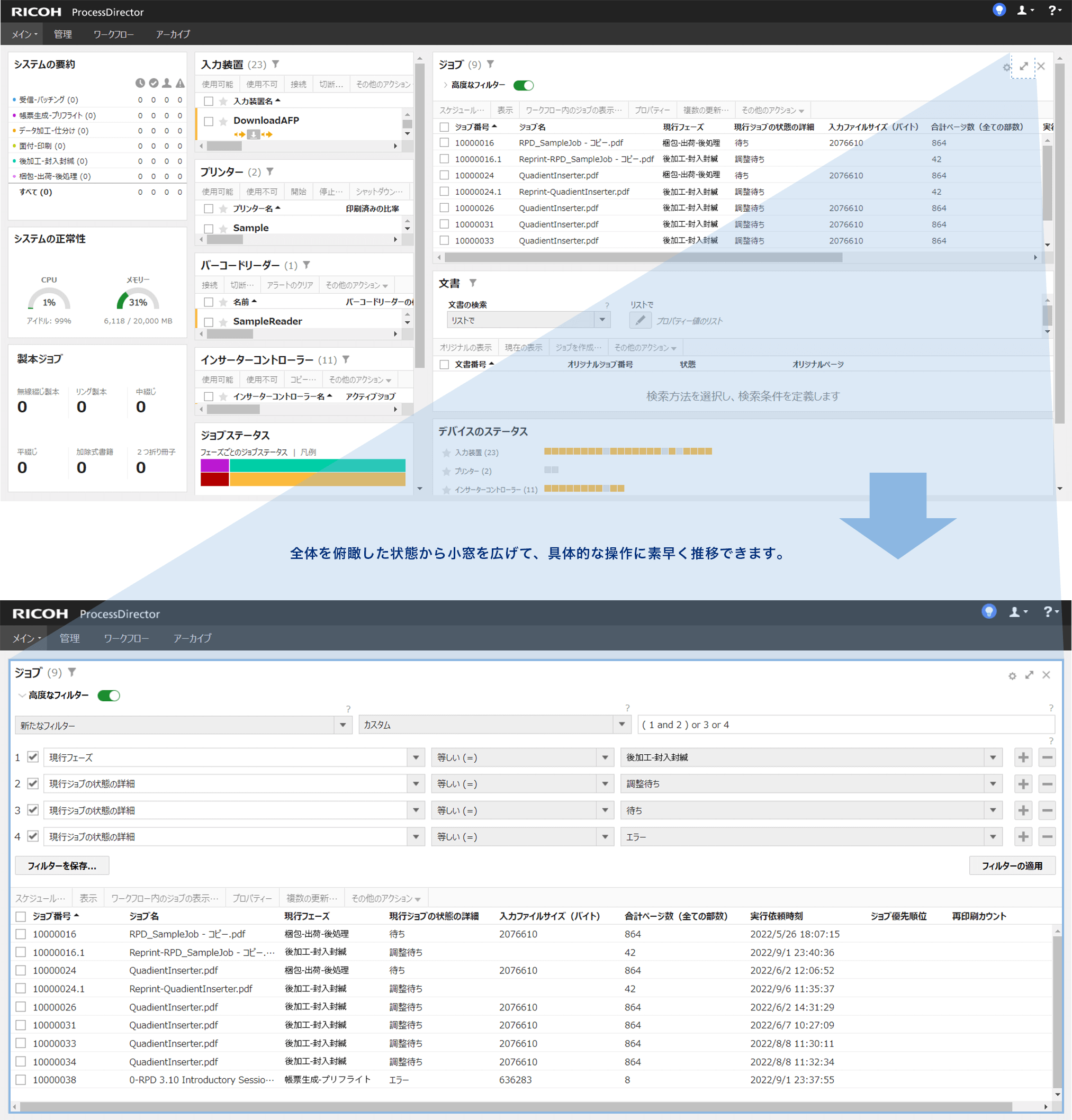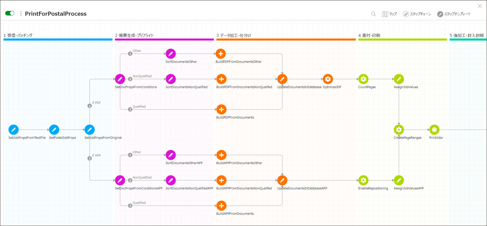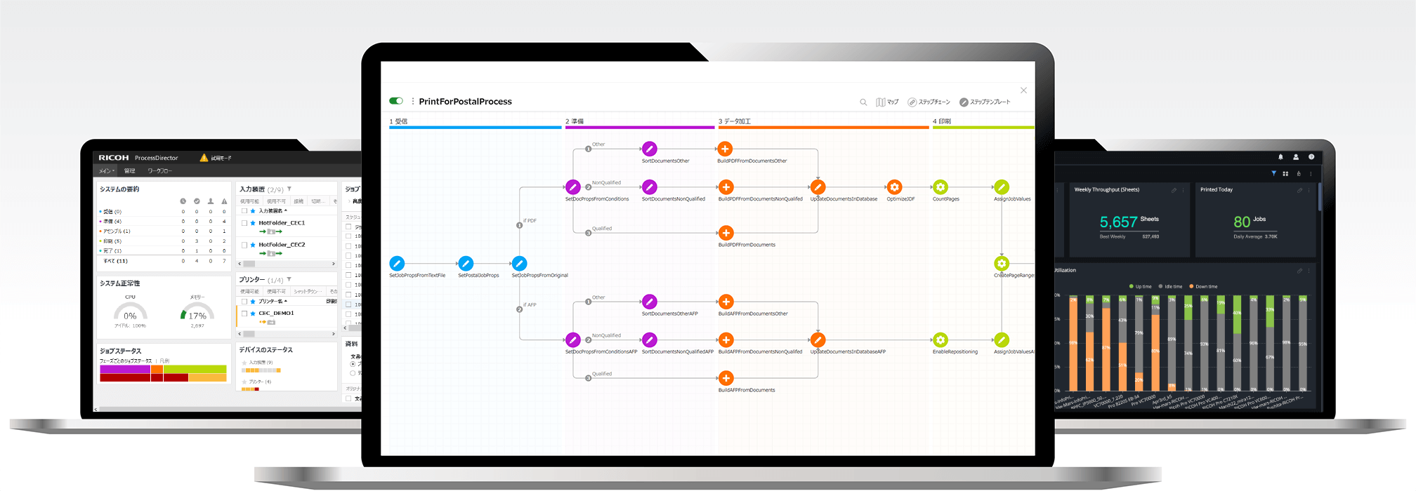 上流システムとは多様な連携機能を持ち、入力ファイルのグルーピング処理も行えます。接続したプリンターとの間では、JMFやIPDSによるジョブ印刷制御に加え、SNMP V3によるデバイス状況把握もできます。更に、メールによる配信、PDF保管、電子帳票システム連携などマルチチャネル出力にも対応します。その他にも、印刷物のバーコード管理、後加工機とのJDF連携や、メールの封入管理、セカンダリーサーバーによる処理能力の拡張、レポート機能によるBIツールと連携した見える化など、プロダクション・ワークフローをエンド・ツー・エンドで支える豊富な機能を提供します。