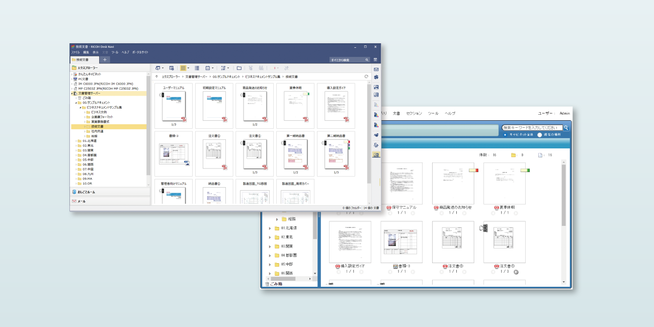 複合機をはじめとするリコーの多様なシステムと連携して文書をハンドリングできる専用ドキュメントポータルソフト『RICOH Desk Navi』での利用。文書の閲覧や登録に特化したWebブラウザーでの利用。二つの操作環境から選べます。
