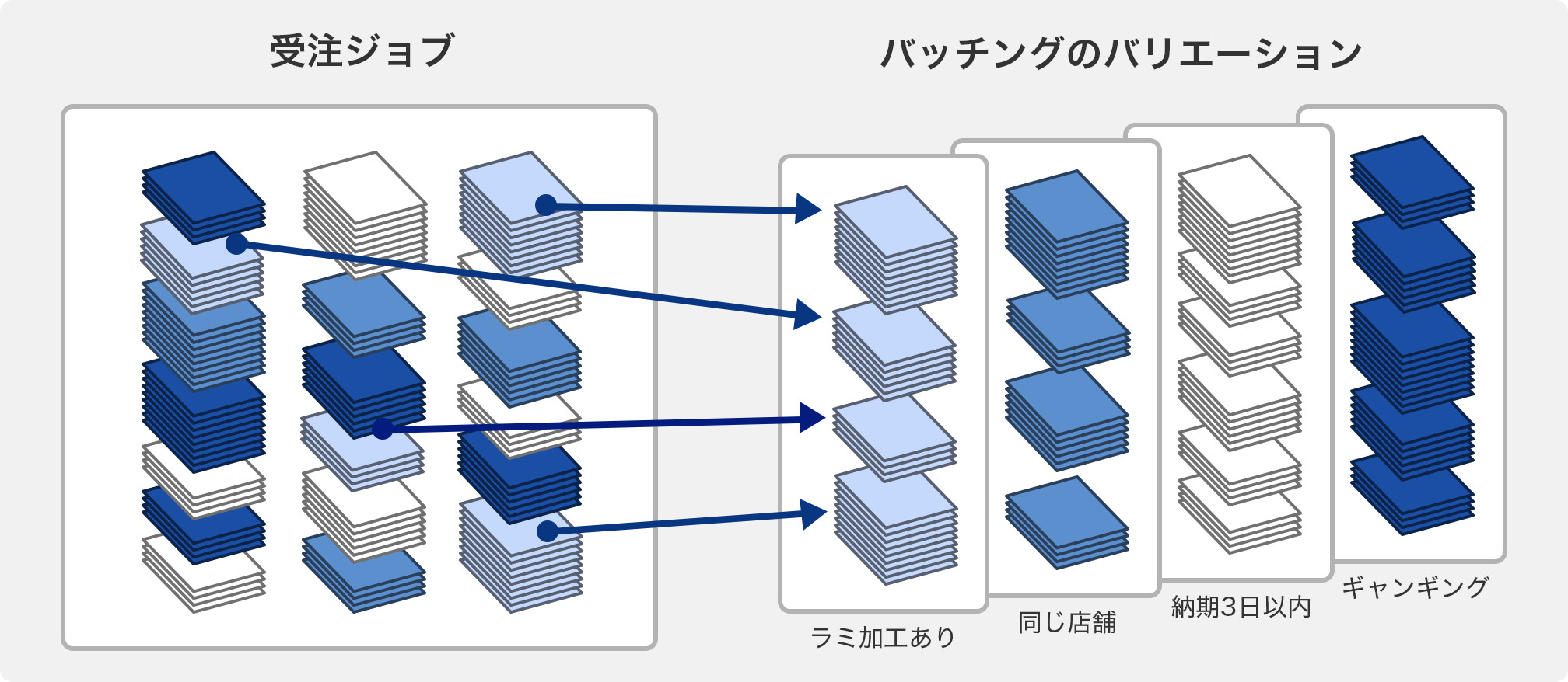 フィルターをかける属性項目は自由に設定できます。例えば、用紙種別、製本の綴じ方、納期など、ジョブ属性に応じて、ジョブのかたまりをつくり、各製造ラインに振り分けて流すことで処理は効率化されます。