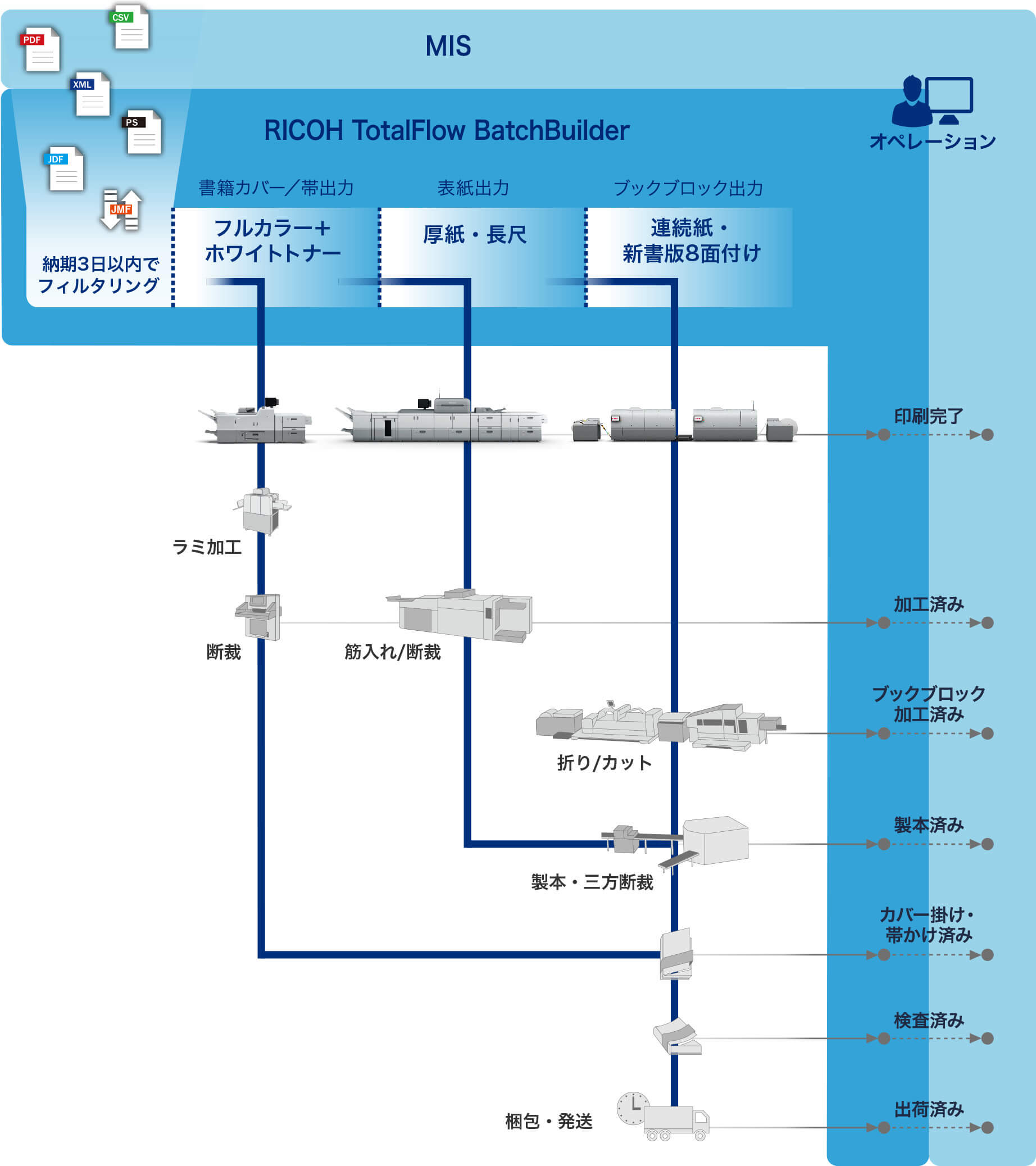 RICOH TotalFlow BatchBuilderは、生産性を高めるシステム。特に段取り替えの多い多品種・少量生産の作業効率化に大きな力を発揮し、短納期化する厳しいビジネス環境を改善へと導きます。