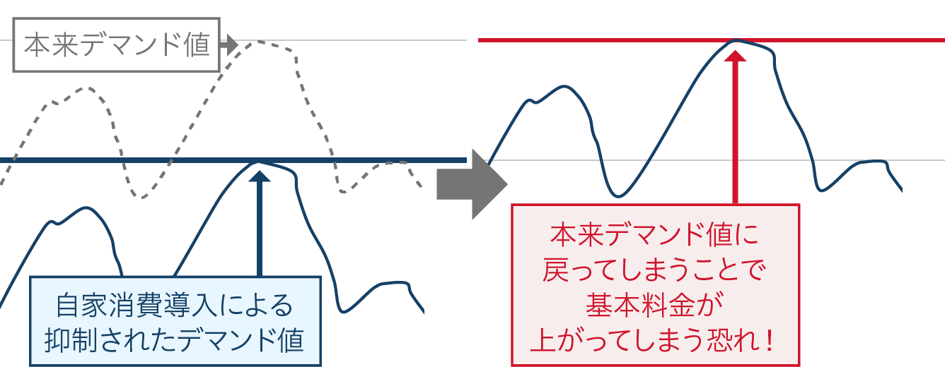 《例》30kWの自家消費型太陽光発電所を設置している場合で、その太陽光発電所がデマンド値抑制に常に100%影響している想定の場合、1ヵ月で56,700円の基本料金が上昇する可能性がある。