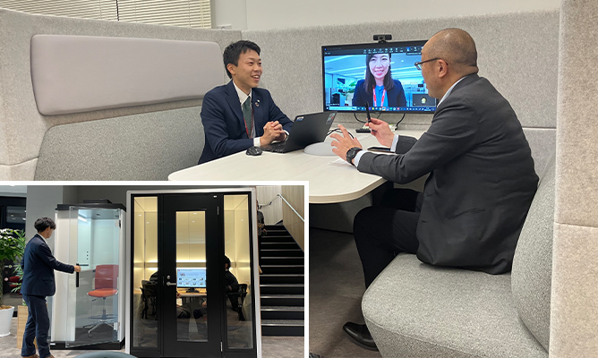 旧オフィスの課題の1つであったリモート会議による「音」問題。シーンに合わせて、個室空間やオープンな空間でミーティングができるよう、コミュニケーションと集中に配慮したウェルビーイングな空間づくりを行っています。