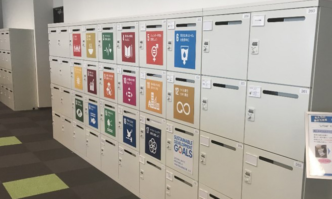 間伐材・端材を使用した什器を採用、オリジナルの啓発グッズを作成配置して、全員がオフィスの中でもSDGsを身近に考えられるきっかけづくりを行っています。