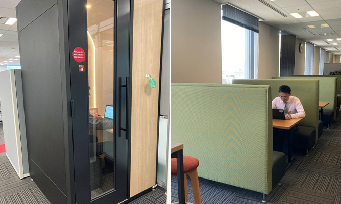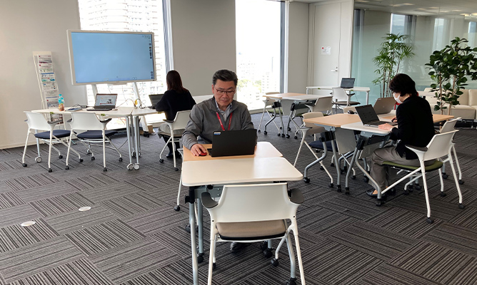 オフィス・社外・在宅等、各自が業務に合わせて最適な働く場所を自由に選択できる、多様な働き方の実現によって個々の社内業務効率化、社員間のコミュニケーション活性化が向上しています。