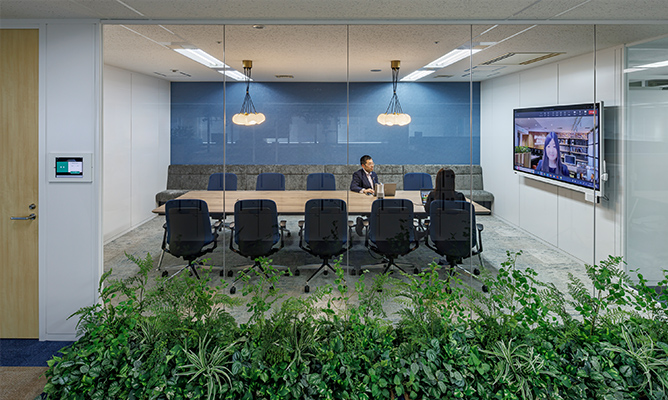 会議の内容や人数によって場所を選べる様々なスペースを構築しました。パソコンを持っていけばサッとWeb会議ができ、まるで同じ空間にいるかのような映像と音響設備を配置することでスムーズな会議をサポートします。