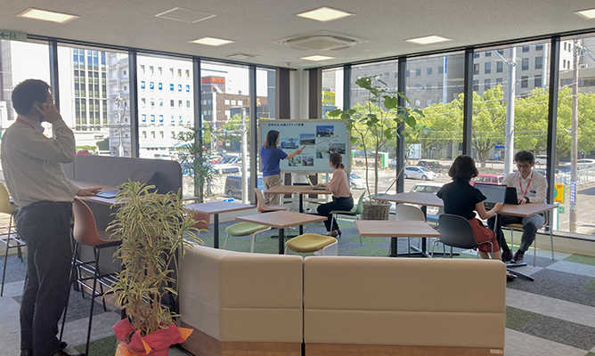 「ひなたスペース」は自然に社員が集まる空間です。リラックスした雰囲気の中、仕事のON・OFF切り替えもできます。デジタルサイネージで社内情報を発信したり、ハドルミーティング、災害発生時には災害対策本部の機能を担っています。