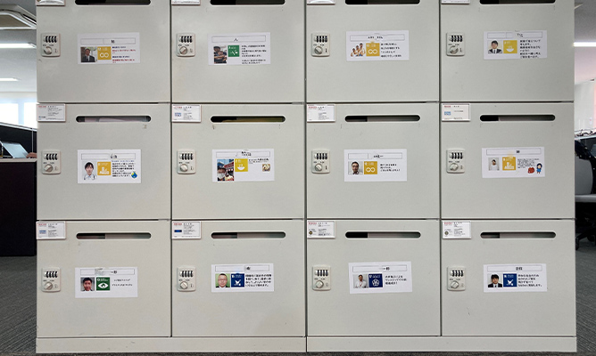 個人キャビネットには社員一人ひとりのMy SDGs宣言のプレートを貼って、社会貢献の意識を高めています。My SDGs宣言をすることで、日常生活で常にSDGsを意識できる環境にしています。
