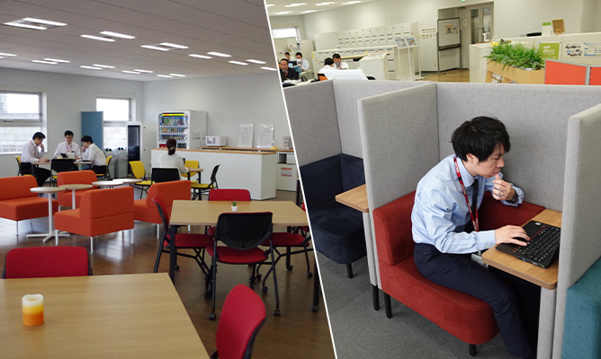 在宅勤務・モバイルワークなど、場所にとらわれずに仕事ができる環境を構築しています。社内でも「集中して資料を作成したい」「リラックスしてアイデアを出したい」…その日の仕事内容に合わせて働く場所を選べるようにしています。
