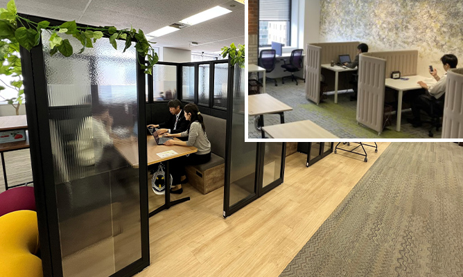 社員の要望を取り入れ、業務に集中できる「フォーカスエリア」を新設しました。さらに、チームで集まりやすい「コミュニケーションエリア」を中央に配置することで、仕事もコミュニケーションも“はかどる”オフィスを実現しています。