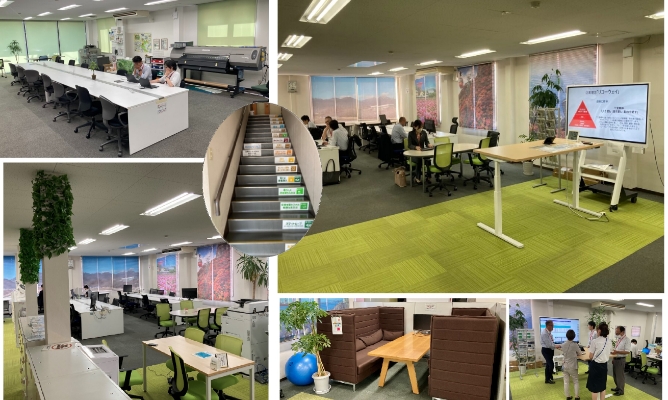 日々実践可能なSDGsの取り組みを社員投票で選出し、作成・掲示しています。社員撮影の近郊風景で加工したオリジナルブラインドは、緑視効果やリラクゼーションを狙い、社員の活力向上や生産性の向上など組織の活性化に繋げています。