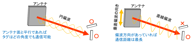 円偏波アンテナは波が旋回して放出され、直線偏波は同一方向で放出されます。この波の向きはタグの向きと密接に関係してきます。直線偏波は偏波方向とタグの向きがあっていなければ交信できませんが、長距離の交信ができる特性があります。タグの向きをそろえられるような運用の場合、直線偏波が向いており、タグの向きがバラバラになってしまうような場合には円偏波が向いています。
