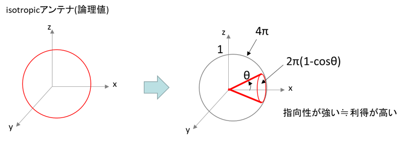 理論上の完全無指向性アンテナ(360°均一に電波を放出するアンテナ)と比較した場合の利得の単位がdBi、1/2波長のダイポールアンテナと比較したときの単位はdBdと表記します。