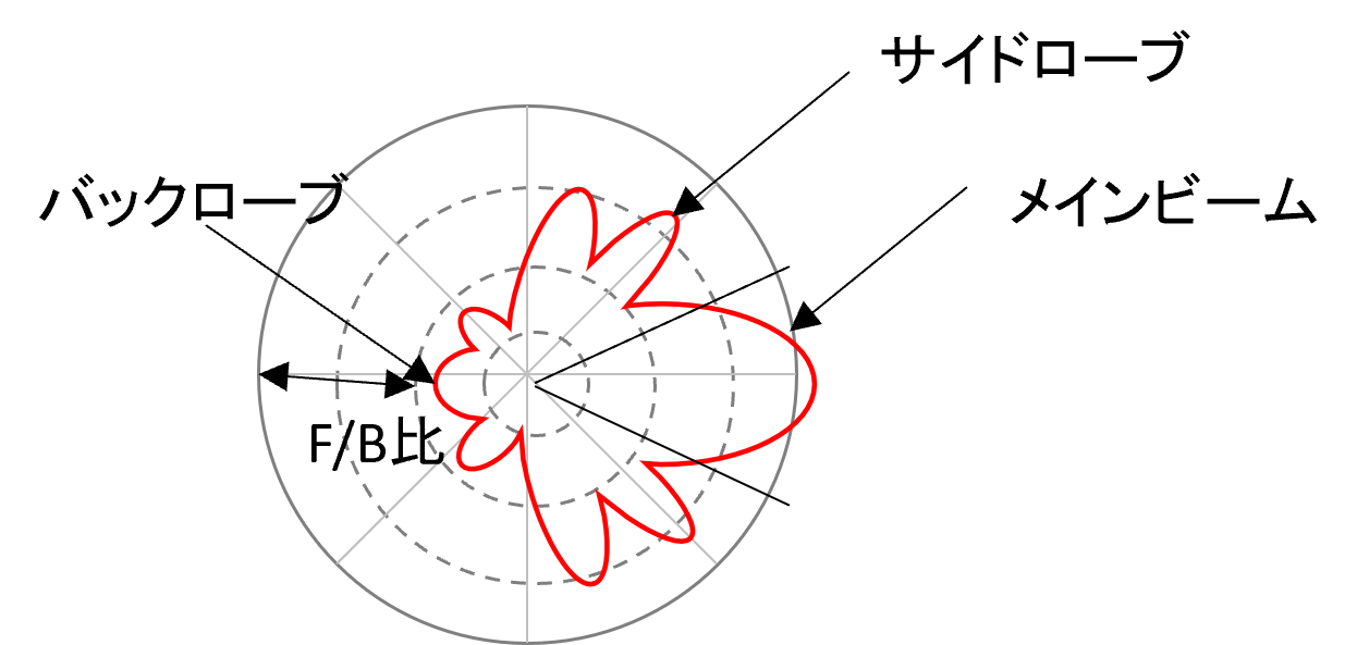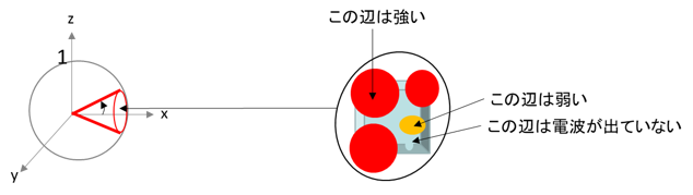 指向性は利得で説明できますが、製品によってはビーム幅や電波放射の図が記載されているものもあります。このビーム幅や図は利得最大値より3dB下がった角度幅、つまり電力が最大値の半分になる幅で表現します。したがって、このビーム幅の外側には電力が放出されず、内側にのみ電力が放出することを示す値ではないことに注意が必要です。