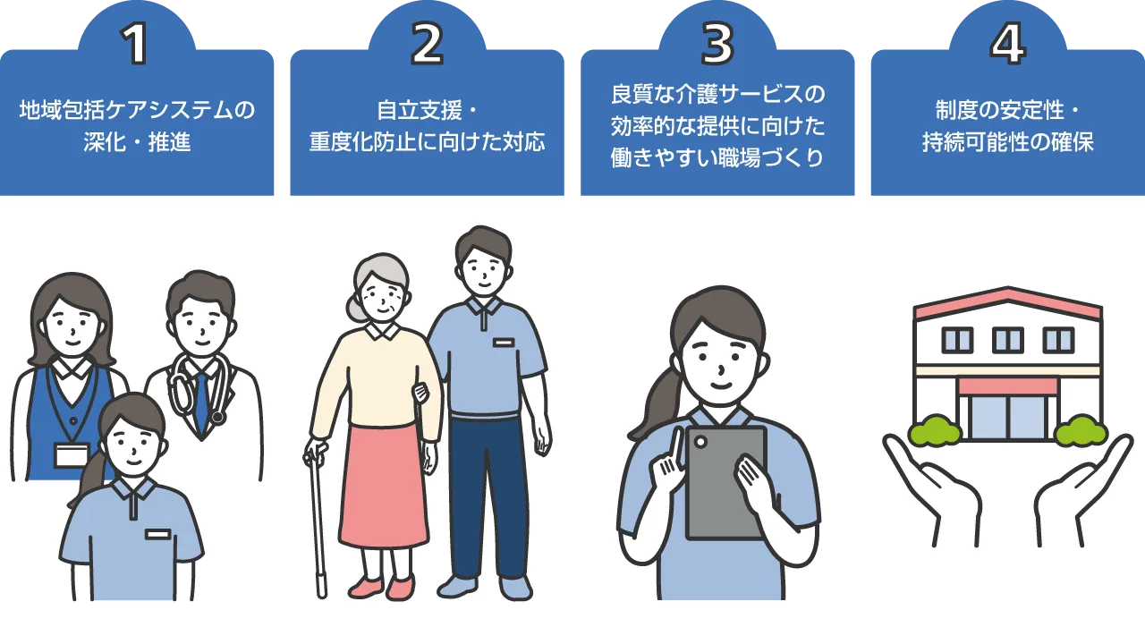 2024年度の介護報酬改定では、本格的な自立支援・重度化防止の基盤づくりに向けて、医療との連携、リハビリ・口腔・栄養の一体的な取り組みが強化されています。