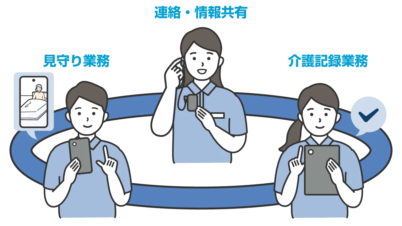 定義は"インカム等職員間の連絡調整の迅速化に資するICT機器"とされており、チャットシステムも該当します。こちらは(Ⅰ)(Ⅱ)に係わらず、"同一の時間帯に勤務する全ての介護職員が使用すること"が要件です。