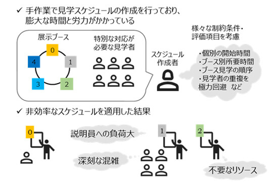 これまでのイベント運営では、見学者のスケジュールは主催者の経験則に基づいて手作業で作成されていました。しかし、多くの制約条件を同時に考慮することが難しく、最適な解を導き出すことが困難でした。その結果、スケジュール作成に数日程度かかっており、業務効率が低下していました。