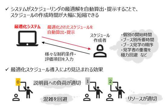 数学的手法をベースとした最適化技術を用いて、複雑な制約条件を考慮しながら最適な見学スケジュールを自動生成するシステムを開発しました。このシステムでは、個別の見学開始時間、ブース別所要時間、ブース見学の順序、見学者の重複回避などの様々な条件を組み込んだ評価関数を構築し、評価関数の値が最良となるように見学スケジュールを自動生成します。本システムにより、見学スケジュール作成時間を大幅に短縮できました。