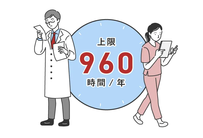 2024年4月1日から、医療に従事する勤務医の時間外・休日労働時間は、原則として年960時間が上限となります(A水準)。医療機関が、地域医療の確保などの必要からやむを得ず、所属する医師にこれを上回る時間外・休日労働を行わせる必要がある場合は、その理由に応じて、都道府県知事から指定を受ける必要があります。