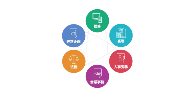 リコージャパンでは、対応領域の広いバックオフィス業務を「総務」「経理」「人事労務」「営業事務」「法務」「経営企画」の6つに分類し、それぞれの領域ごとに最適なソリューションをご提案し、お客様の業務改善や生産性向上をご支援いたします。