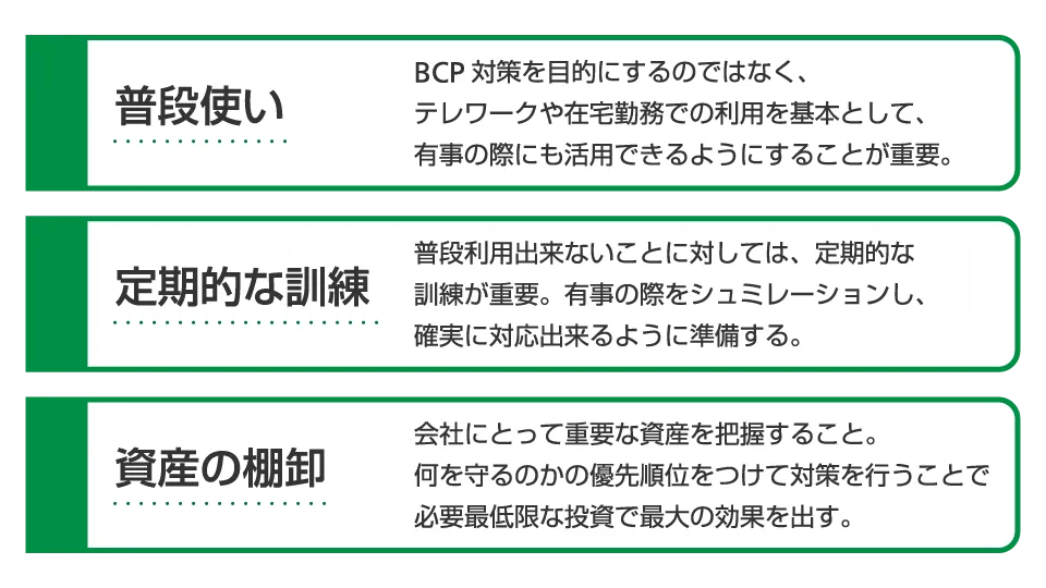 BCP対策は、策定して終わりではありません。有事の際にスムーズな業務復旧と事業継続を実現するためには、普段から実践を意識した準備が欠かせません。