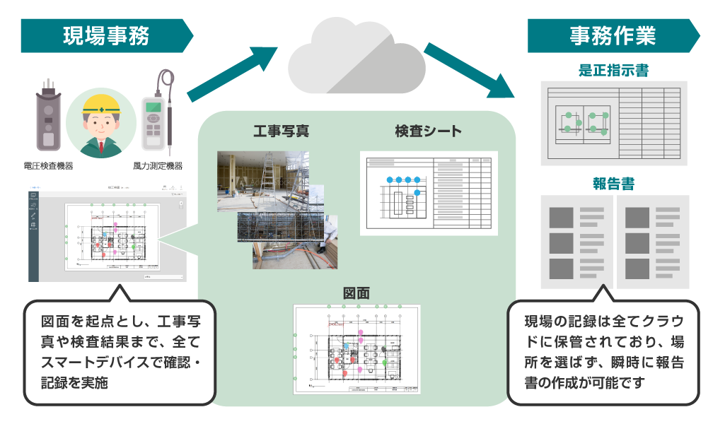 現場では、図面の枚数が多い、検査結果の記録が大変。事務所では、工事写真の整理や、台帳・報告書の作成で残業が慢性化している・・・。アナログな業務を改善し、現場の働き方改革を実行しませんか?