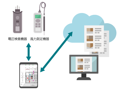 検査に利用した測定機器とクラウドで連携。測定結果を報告書の作成に流用可能となり、転記作業を軽減します。必要な情報を集約した報告書は瞬時に作成可能です。