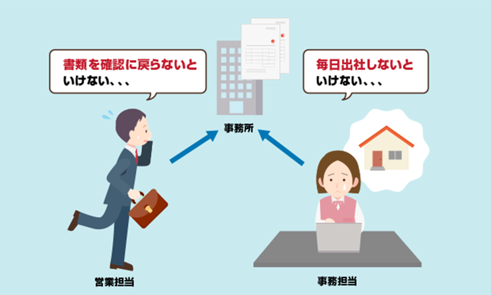 営業担当者は、モバイルデバイスの活用で、必要な時にどこからでも社内データを閲覧・利用ができて営業効率が上がります。事務担当者は、いつでもどこからでも仕事ができる、働きやすい職場環境になります。