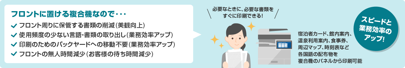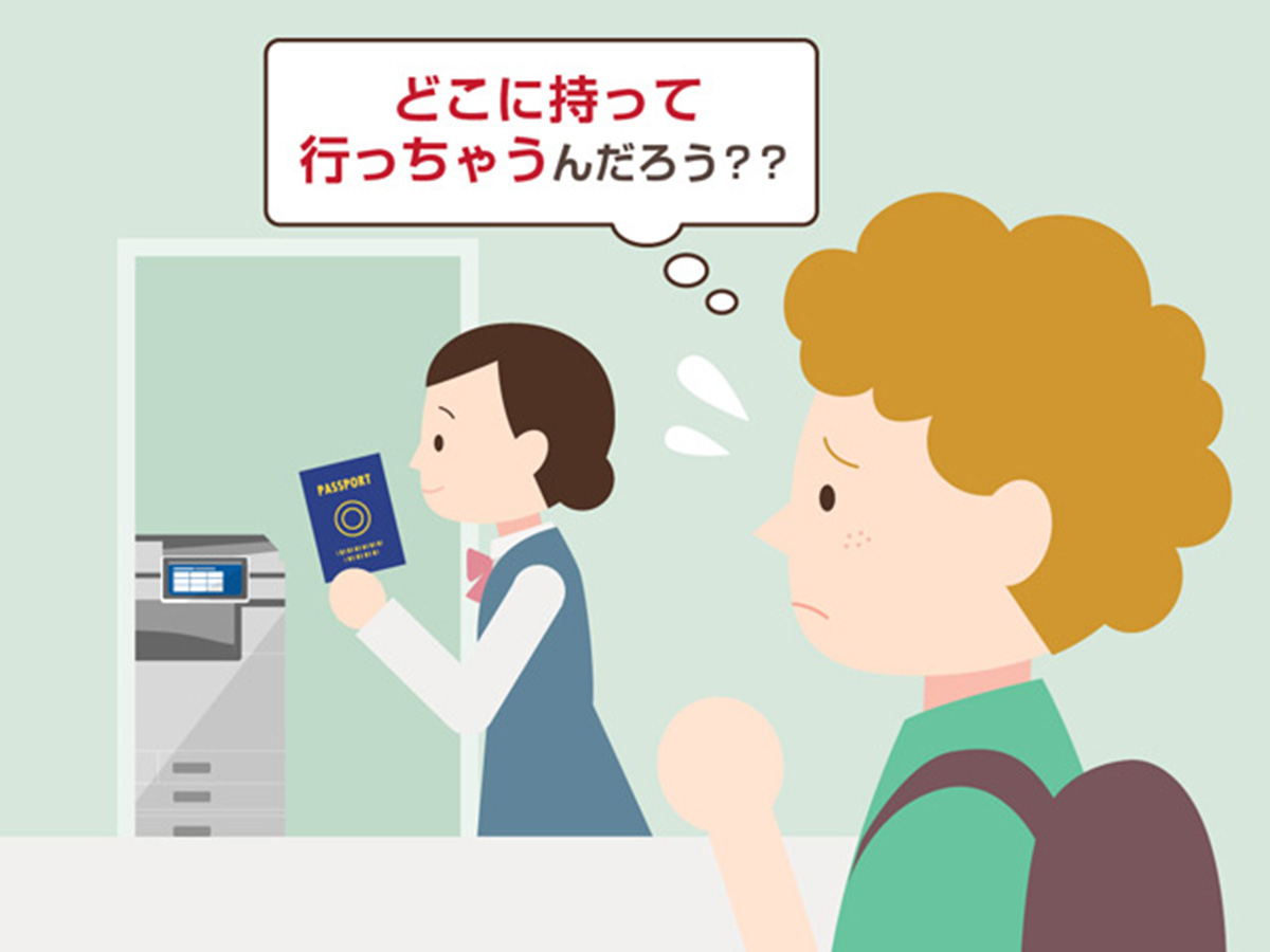 外国人宿泊客の増大に伴い、宿泊施設のフロントの接客業務はとても多忙です。そこで近ごろ負担となっているのが、外国人客のチェックイン対応。言葉の問題はさることながら、パスポートの写しを取得する作業は面倒な作業の1つです。見えるところで処理しなければ、お客様は不安。しかし、複合機はバックヤードにしか置いていない……。警察や保健所から提出を求められたとき以外使わないとはいえ、取得した写しは3年以上保管しなければならず、個人情報を管理する手間もかかります。